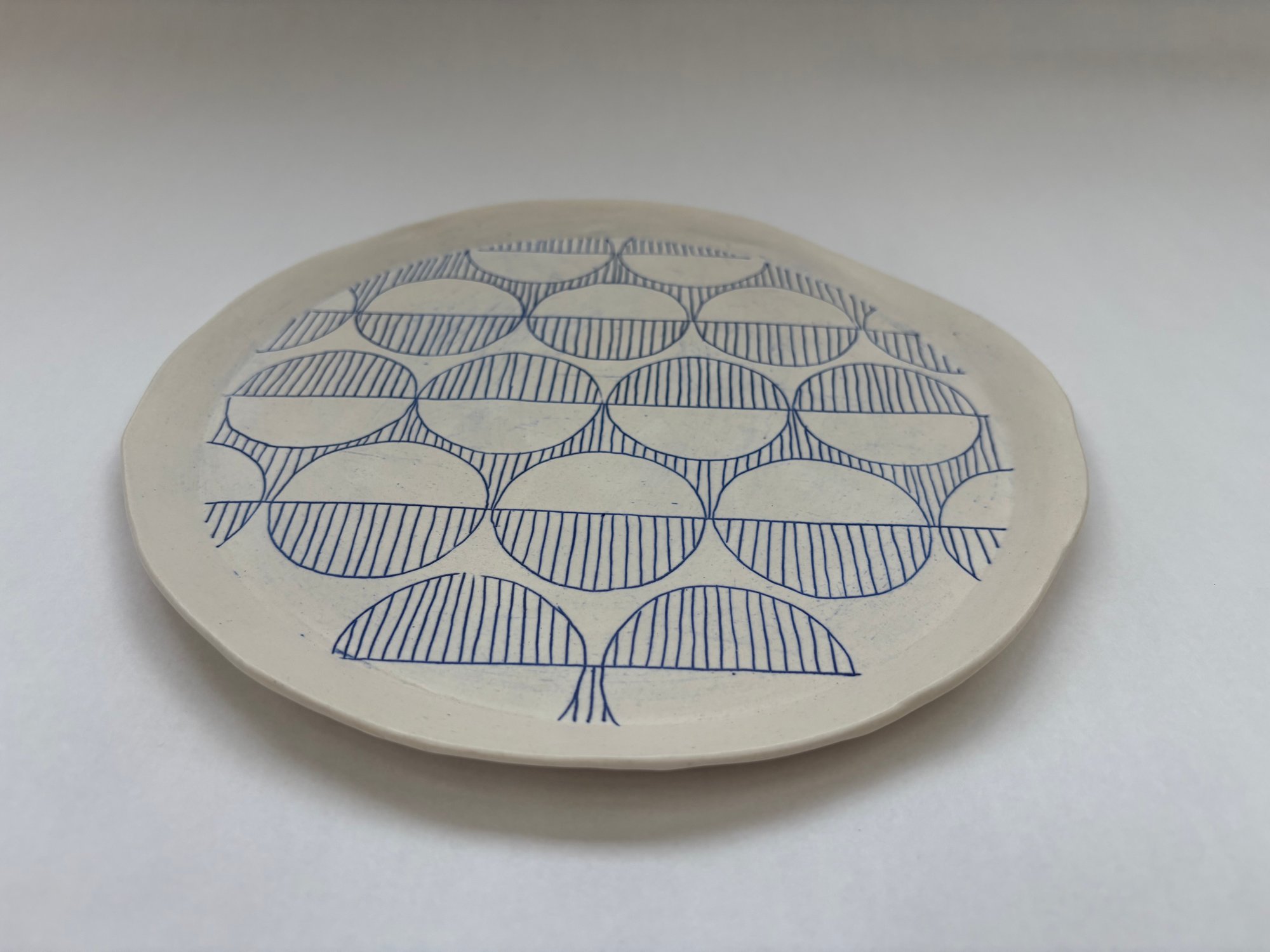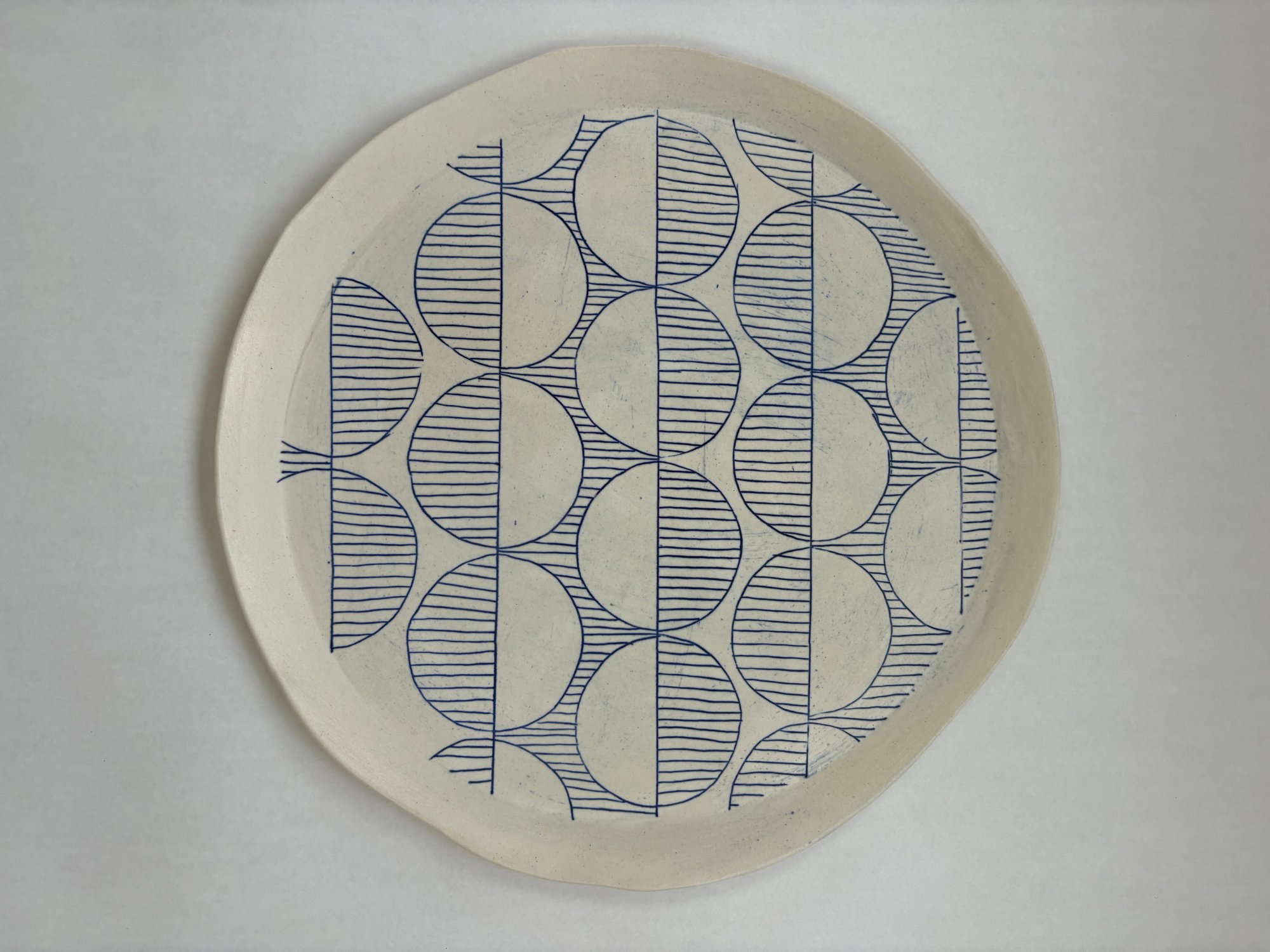 Handmade plate, slightly round, slightly irregular. Whether you are looking for a dinner plate or a platter for your cheese & crackers, this will be perfect.
