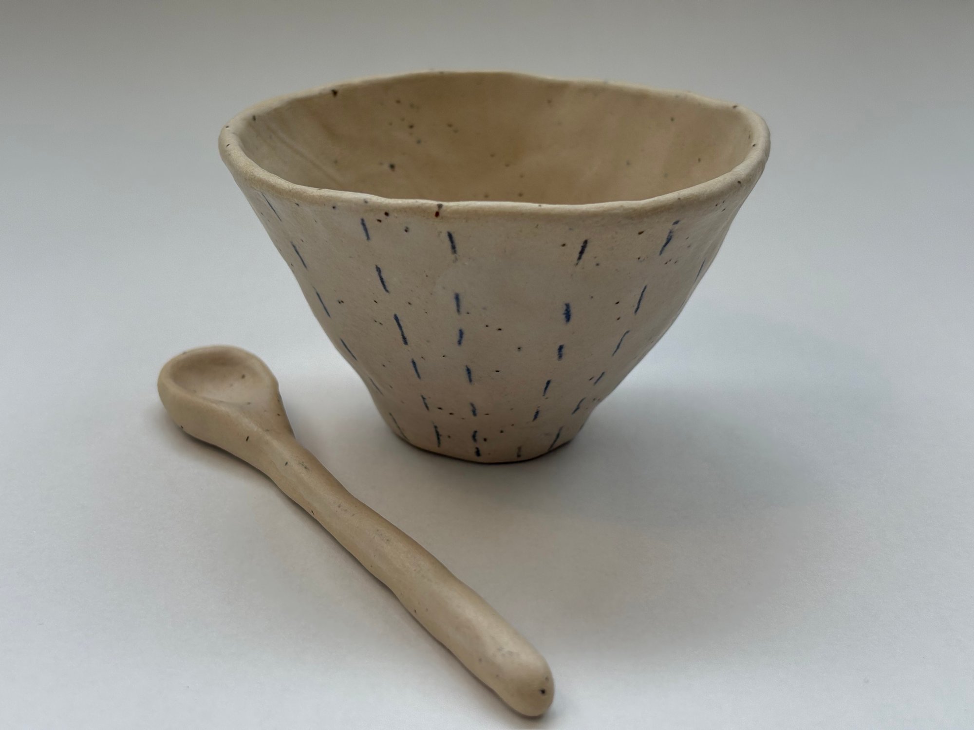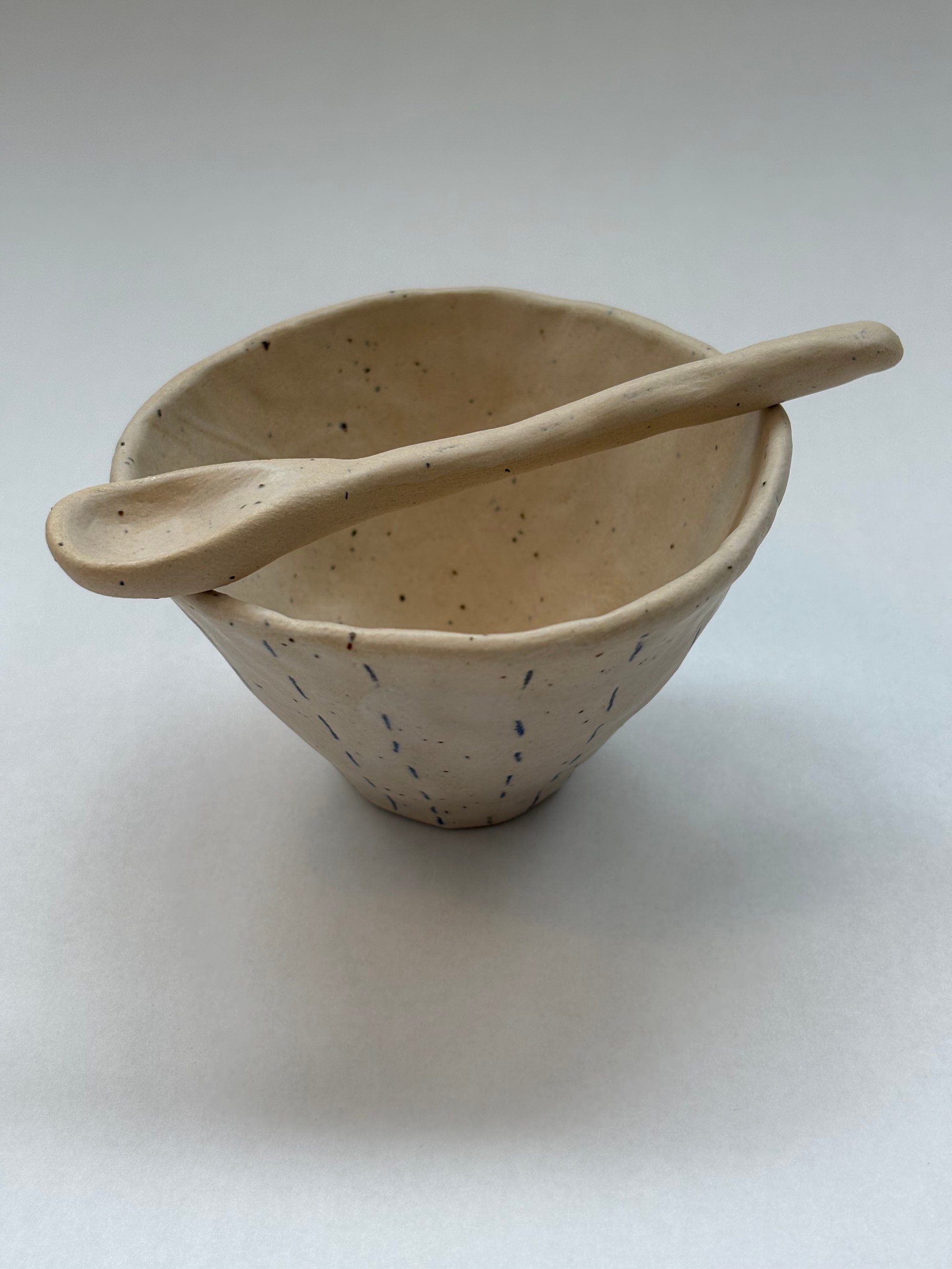 A sweet little hand pinched bowl with spoon perfect for dips, salad dressings or salt by your stove.