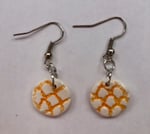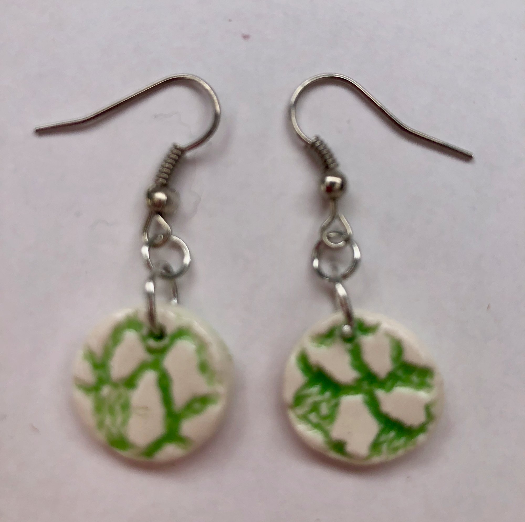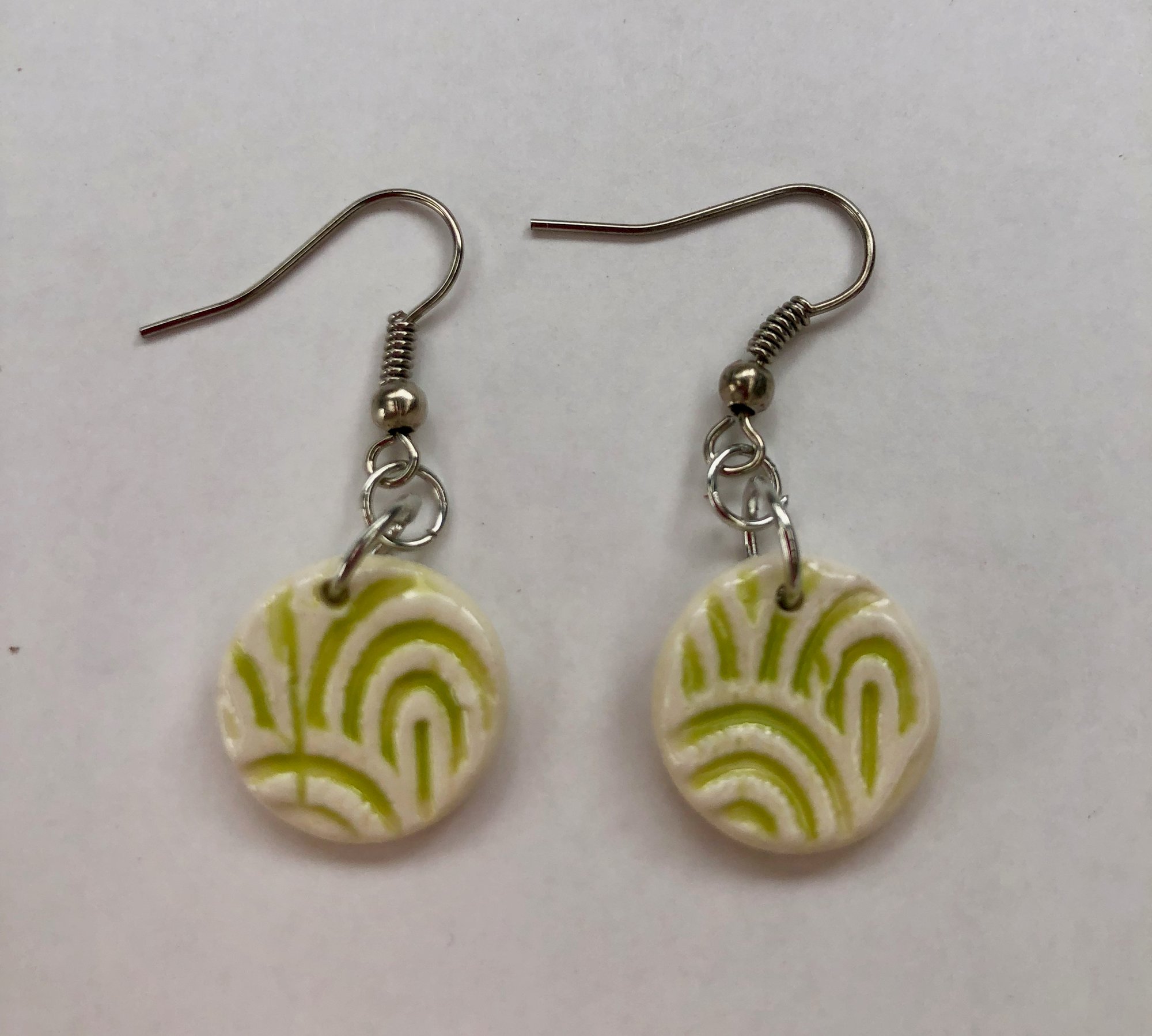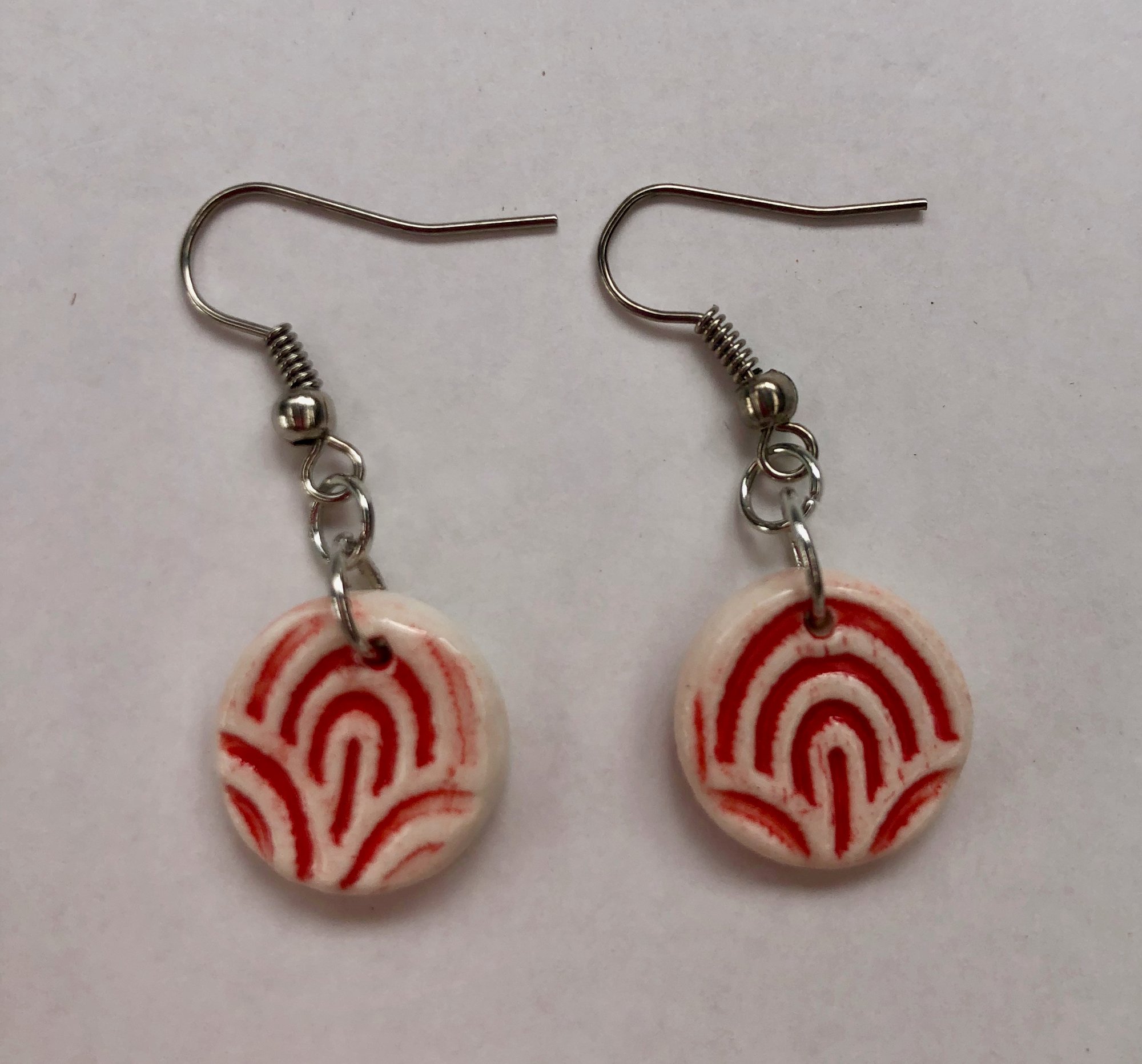 These fun small pendant earrings are imprinted in textual patterns and have a pop of bright colour.